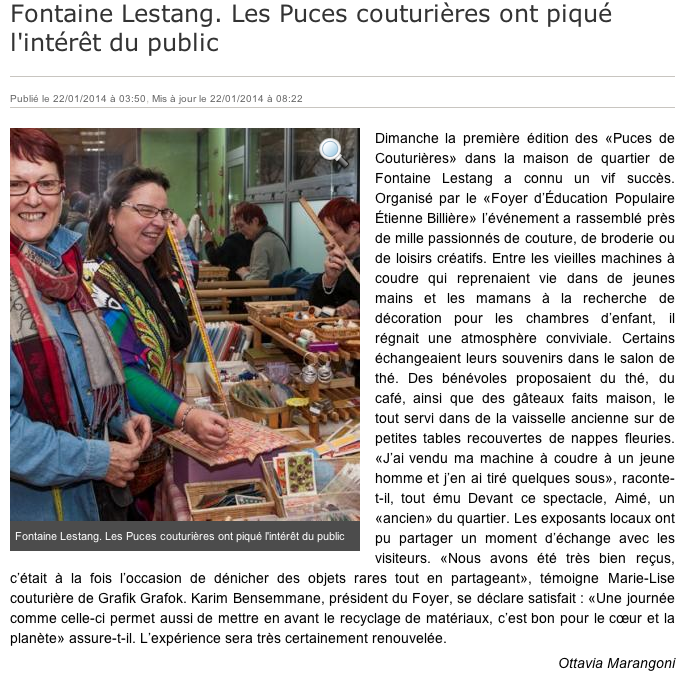 (Extrait tiré de l’article écrit par Ottavia Marangoni publié le 22/01/2014.“ Fontaine Lestang, Les Puces couturières ont piqués l’intérêt du public ”) (Cf article en bas de page)