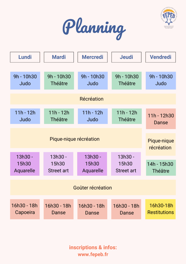Au programme : judo, théâtre, danse, aquarelle, capoeira et street art. C’est l’occasion de permettre à vos enfants de découvrir plein de nouvelles d’activités avec les professeurs habituels du Fepeb.
